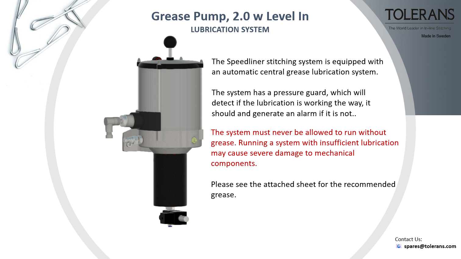 The system must never be allowed to run without grease!